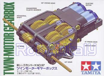 La locomozione del robot è ottenuta mediante il doppio motoriduttore Tamiya 70097, che viene distribuito direttamente dalla Tamiya. Il kit contiene due piccoli motori DC che trasmettono il moto a due assi esagonali da 3mm separati. Di seguito è riportato un estratto del datasheet con le caratteristiche salienti: