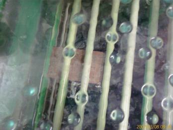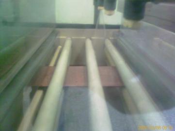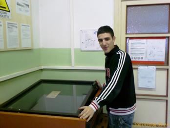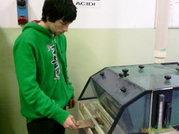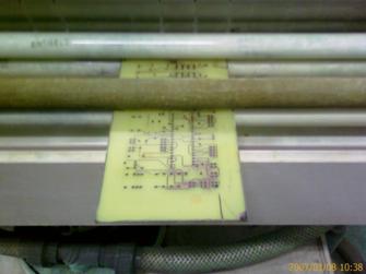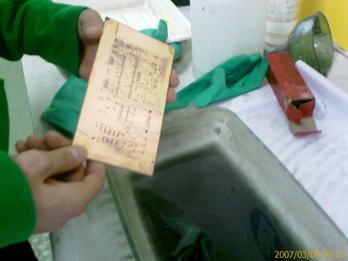 Ormai la vernice fotosensibile è stata tutta disciolta e ora possiamo lavorare in un ambiente più luminoso. In quest'ultima fase non rimane che eliminare il rame dalle zone vuote utilizzando la soluzione di cloruro ferrico. Per questo scopo nella nostra scuola è presente un macchinario che spruzza dell'acido sia da sopra che da sotto. In questo modo il rame non ricoperto dalla vernice viene "lavato" via. |