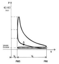 Tramite il movimento del pistone, la carica viene compressa e quindi sottoposta ad un aumento di temperatura (nel caso ideale ciò avviene senza cessione di calore all'esterno), fino al punto in cui il pistone giunge al punto morto superiore.