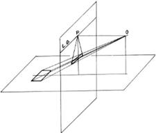 Poniamo ora un punto A nella spazio definito dell'angolo diedro e costruiamo le sue proiezioni. A questo punto fine conduciamo dal punto A le perpendicolari ai piani H e V. I punti di intersezione A' ed A'' delle perpendicolari con questi piani sono dette proiezioni ortogonali del punto A. Ruotiamo ora il piano H attorno all'asse x sino a farlo divenire un'estensione del piano V. Così si ottiene la rappresentazione ortogonale del punto A, indicata in fig.2b. Le perpendicolari condotte dal punto A ai piani di proiezione sono dette rette di proiezione, il punto A' è la proiezione orizzontale mentre il punto A'' è la proiezione verticale