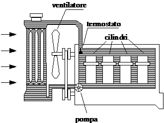 Il raffreddamento ad acqua (Figura 26) si basa su un radiatore, all'interno del quale l'acqua viene raffreddata dal passaggio dell'aria, e da una pompa che la invia vicino ai cilindri.