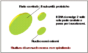 Struttura del DNA: nel c. eucariote il DNA si presenta combinato a delle proteine. Questa combinazione di DNA e proteine forma una sostanza chiamata cromatina. Le proteine più grosse nella cromatina sono chiamate istoni. Il DNA si lega agli istoni in maniera diversa a seconda dei diversi tipi di istoni (vi sono 5 tipi di istoni). In genere il DNA si lega agli istoni nel seguente modo, formando molecole dette nucelosomi: