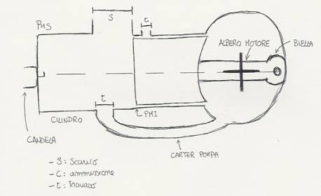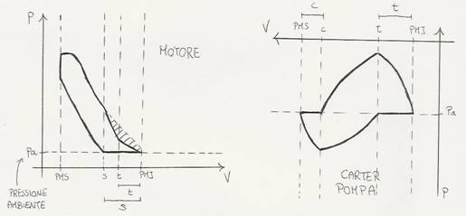 CARTER POMPA: partendo dal PMS, la pressione rimane costante a quella ambiente fino a che non è chiuso il foro di ammissione il quale consente l'introduzione di carica fresca. Una volta chiuso il foro la pressione cresce fino a che non comincia ad aprirsi il foro del travaso, che consente il passaggio della carica dal carter pompa al cilindro e, la conseguente, caduta di pressione fino al raggiungimento del PMI e della pressione ambiente. Durante la corsa verso il PMS, la pressione rimane costante e uguale a quella ambiente fino a che il foro del travaso non si chiude, da quel punto cala vertiginosamente fino a che non si apre il foro di ammissione che consente la crescita e il raggiungimento della pressione ambiente al PMS, pressione a cui si inietta la carica nel carter pompa.