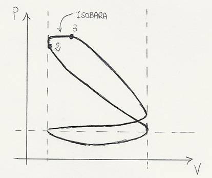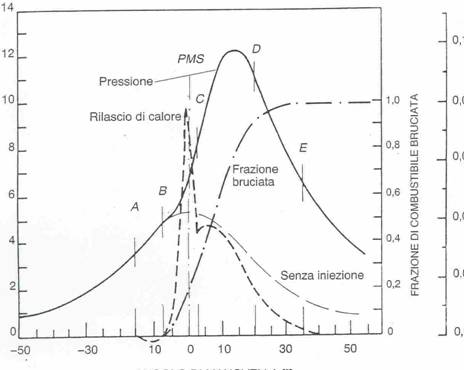 Fase D -E: l'iniezione termina, la combustione continua solo con il combustibile rimanente con il calo di calore fornito.