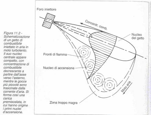 l'iniezione si ha nella parte laterale (quindi ben miscelata), ma a ridosso del flusso centrale, non troppo isolato dove sono presenti molecole troppo magre. Il gasolio che continua a entrare prenderà il posto di tutti i nuclei di accensione fino al riempimento della camera. Il fronte di fiamma si sposta verso l'interno del getto, poiché al riempimento della camera il carburante riesce a miscelarsi mentre prima non poteva.