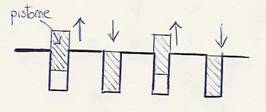 MOTORE: partendo dal PMS, nel momento in cui si è raggiunta la pressione massima durante la fase di combustione, la pressione all'interno del cilindro diminuisce per effetto dell'espansione dei gas presenti all'interno del cilindro, causando, conseguentemente, un aumento di volume all'interno della camera. La caduta di pressione è caratterizzata da gradienti differenti, infatti da un andamento lineare, si passa ad una caduta più ripida per effetto dell'apertura del foro di scarico che fa crollare la pressione all'interno del cilindro; quando poi si apre pure il foro del travaso, la carica fresca dal carter pompa giunge nel cilindro a pressione più elevata rispetto a quella atmosferica e riduce la pendenza della caduta di pressione. Raggiunto il PMI, durante la corsa verso il PMS, la pressione rimane costante e uguale a quella ambiente fino a che entrambi i fori: travaso e scarico non sono chiusi. Successivamente la pressione sale e raggiungerà un picco massimo al PMI durante la fase di combustione. Da notare che nella corsa verso il PMI ci si mangia una parte di lavoro utile causato dall'elevato gradiente di discesa della pressione.