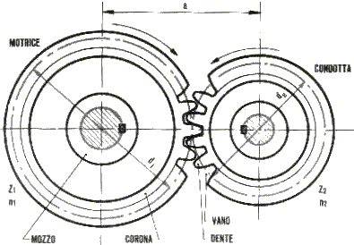 E' opportuno notare che, nel caso di ruote che ingranano con dentatura esterna, il verso di rotazione della ruota condotta, è opposto a quello della motrice ( ovviamente sarà diverso anche in modulo grazie al rapporto di trasmissione );