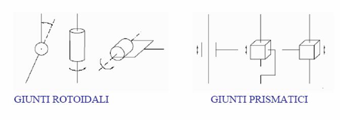 I giunti rotoidali consentono il movimento rotativo, come si vedi in figura, dei bracci collegati da esso mentre i giunti prismatici consentono solo il movimento di traslazione lungo l'asse.