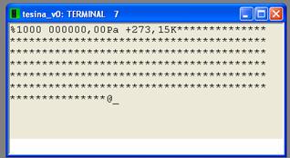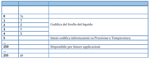 Dopo la visualizzazione del carattere %, sono previsti, come già accennato 4 caratteri per contenere l'informazioni circa il livello del liquido, altri 6+2(cifre prima virgola + cifre dopo virgola) caratteri per il controllo della pressione (misurata in Pascal) e altri 1+3+2(segno + cifre prima virgola + cifre dopo virgola) per il controllo della temperatura misurata in Kelvin.
