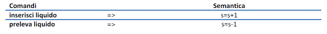Tali comandi operano sull'informazione contenuta nello stato della cisterna "livello del liquido" che è codificata su 4 byte. L'intero record contenente lo stato della cisterna ha dimensione di 256 byte. Le operazioni base, "inserisci liquido" e "preleva liquido" agiscono per valori discreti, se s è il valore del livello del liquido, si ha: