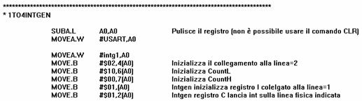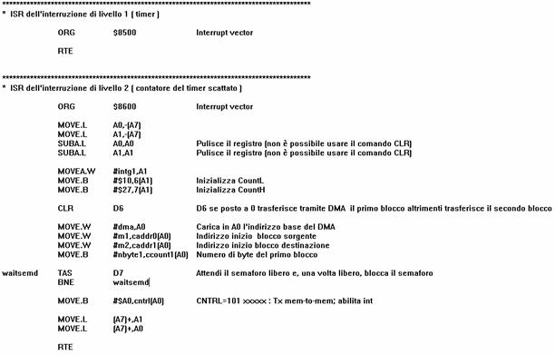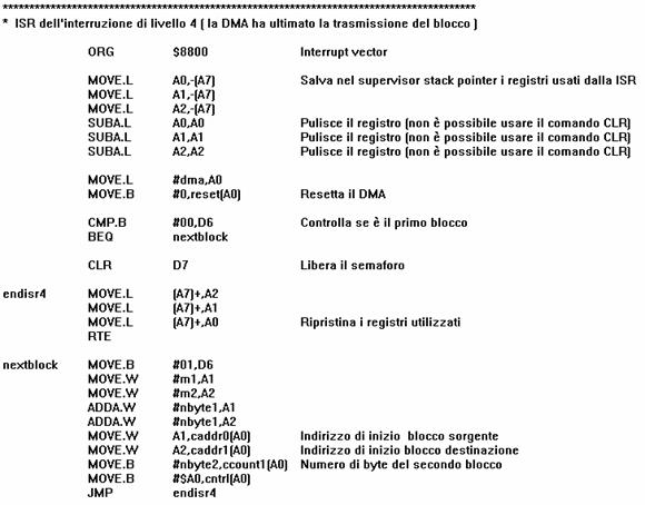 L'interruzione è quella relativa alla linea 4 e verifica innanzitutto se si tratta del primo blocco o del secondo ad essere stato appena trasferito: se D6 è posto a zero vuol dire che è stato trasferito il primo blocco; se invece D6 è posto ad 1 vuol dire che è stato trasferito il secondo blocco e quindi termina. Altrimenti dopo aver resettato il DMA trasla l'indirizzo di partenza del primo blocco e passa al trasferimento del secondo blocco.