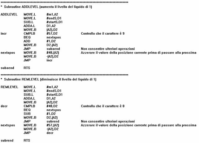 Queste subroutine hanno il compito di verificare il livello del liquido e nel caso che la cisterna sia piena, impedire l'aggiunta di un nuovo livello, mentre nel caso in cui il livello sia pari a 0 impedire il prelevamento di ulteriore liquido. Chiaramente queste subroutine vanno a modificare direttamente la memoria M1: in realtà dovrebbero inviare comandi alla cisterna: attualmente, in fase di simulazione, ci si accontenta della scrittura diretta in memoria.