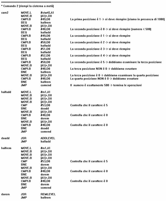 Il comando 2, invece, riempie la cisterna a metà: se il liquido supera 500 viene riportato a questo livello tramite la rimozione di liquido, se invece è inferiore a 500 viene inserito. Al fine di prendere quanto più velocemente possibile la decisione se inserire o aumentare il liquido, sono stati previsti una serie di controlli circa l'individuazione del livello della cisterna.