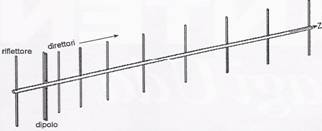 L'antenna Yagi-uda: quando si vuole puntare l'antenna direttamente verso il trasmettitore conviene utilizzare antenne direttive sia sul piano orizzontale che sul piano verticale,un dispositivo con queste caratteristiche è proprio l'antenna yagi. Queste antenne sono le più diffuse in tutto il mondo e sono utilizzate maggiormente per la ricezione dei segnali televisivi. Gli elementi essenziali sono:il dipolo che può essere sia λ/2 che ripiegato,il riflettore che si trova dietro al dipolo e poi vi sono i direttori davanti al dipolo.