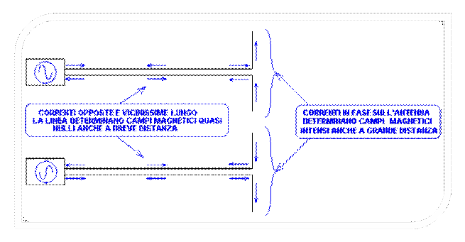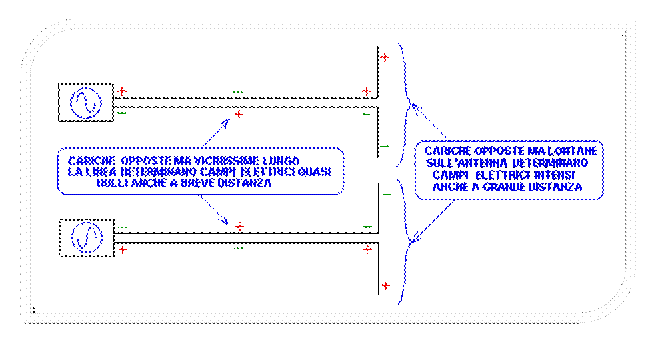 I campi elettrici e magnetici lungo il cavo si annullano quasi completamente per compensazione essendo i conduttori attraversati da cariche elettriche vicinissime e di segnale opposto, lungo l'antenna invece le cose cambiano, in quanto le cariche di segna positivo si trovano su uno stilo lontano da quelle di segno negativo che si trovano sull'altro stilo ed inoltre le correnti elettriche non risultano opposte, come avviene lungo il cavo, bensì allineate in modo da intensificare l'effetto del campo che esse producano.