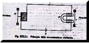 Il microfono, a granuli di carbone, consente la conversione della pressione dell'onda sonora in variazioni di resistenza dei microfono stesso. Infatti le onde sonore di compressione e rarefazione, che incidono sulla membrana M, la fanno vibrare i granuli di carbone risultano più o meno compressi in sincronismo con le oscillazioni della membrana e quindi la resistenza del microfono varia.