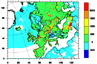 Fig. 9 Distribuzione spaziale delle deposizioni di piombo (kg km-2a-1) in Europa nel 2005 (EMEP, 2007). |