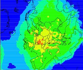 Fig. 7 Distribuzione spaziale in aria di ammonio gassoso e particolato in Europa Europa (mg Nm-2) (EMEP, 2004). |