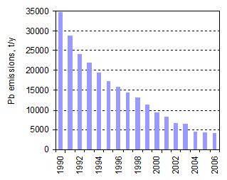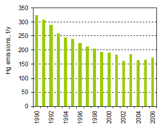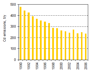 I trend relativi alle emissioni antropiche di piombo, cadmio e mercurio nel periodo 1990-2006 sono indicati nella figura 8, dove si nota una riduzione per tutti e tre i metalli, rispettivamente dell'88% per piombo, 50% per cadmio e del 46 % per il mercurio. Si stima una ulteriore potenziale di riduzione relativo alle emissioni fino al 2010 pari circa al 40% per cadmio, cromo e nichel e di circa il 57% per piombo (Pacyna et al., 2007).