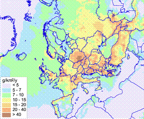 Fig. 10 Distribuzione spaziale delle deposizioni di cadmio (g km-2a-1) in Europa nel 2005 (EMEP, 2007). |