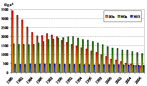 La maggiore riduzione si è verificata a partire dai primi anni '90, grazie alla ripresa economica dell'est europeo. La diminuzione nelle emissioni ha avuto come risultato quello di ridurre i livelli di inquinamento atmosferico e, nel complesso, ambientale. La riduzione di solfato in aria e nelle deposizioni, che ha portato ad un incremento del pH delle piogge, è diminuita anche se non altrettanto marcatamente come le emissioni (Fig.5).