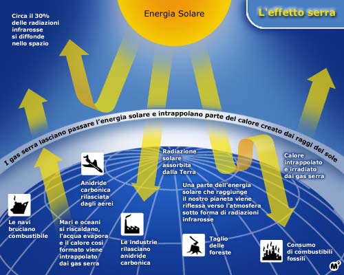 Dalla rivoluzione industriale, l’incremento nell’uso di combustibili fossili ha causato un aumento del 30% della concentrazione di anidride carbonica nell’atmosfera, che ha raggiunto 358 ppm (parti per milione). Tale condizione si è aggravata a causa della progressiva distruzione delle foreste (deforestazione) che, eliminando le piante, ne annulla l’azione fotosintetica di riciclaggio della CO2; in questo modo, nell’atmosfera si accentua lo squilibrio tra input (immissione) e output (fuoriuscita) di anidride carbonica. Nel corso della seconda metà del XX secolo, si è registrato anche l’incremento di altri gas serra; in particolare, del metano, derivante da allevamenti di ruminanti, dalle risaie e dalle attività industriali, che è aumentato del 145%; degli ossidi di azoto, prodotti da alcune lavorazioni agricole e dai gas di scarico degli autoveicoli; dell’ozono degli strati più bassi dell’atmosfera (troposfera), prodotto per effetto di reazioni chimiche di agenti inquinanti.