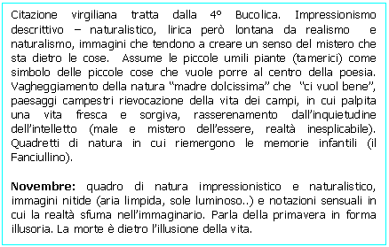 Nella descrizione della campagna (Novembre) l'ingannevole primavera in realtà è "l'estate fredda dei morti"; il canto del rapace notturno (L'assiuolo) diventa un canto di morte; il suono delle cavallette richiama il tintinnio di porte che non si aprono più; la magica fioritura primaverile lascia spazio ad un albero strano e triste (Il vischio). In queste visioni di natura si manifesta l'animo decadente di Pascoli tormentato da inquietudini e angosce. Il piccolo proprietario agricolo è una figura positiva che serenamente domina il suo piccolo mondo. (La siepe)