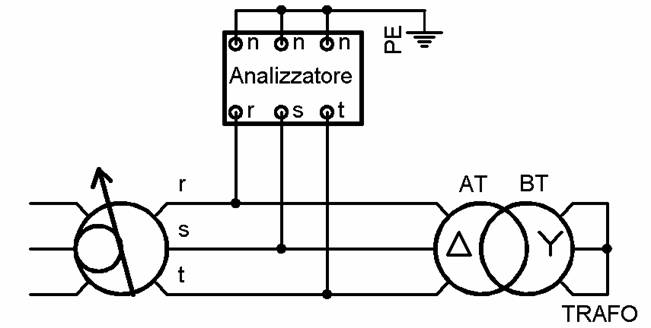 Note: per la prova in corto si è voluto utilizzare uno schema di inserzione diverso da quello qui sopra esposto: l'apparto di misura infatti è stato sostituito con un analizzatore di rete al fine di ridurre il numero di strumenti e facilitare la raccolta dei dati (che in questo caso sono stampati su uno scontrino). Lo schema utilizzato è riportato nella pagina seguente