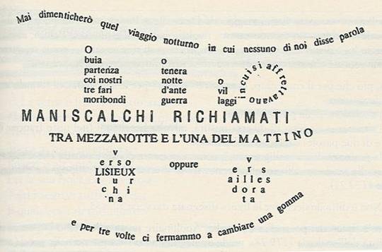 Le parole non seguono più una regola, ma formano disegni, cerchi, richiamano la figura delle ruote dell'auto, dei sedili, del volante e le linee curve addirittura la forma della strada. Come nella "Correzione di bozze + desideri in velocità", anche qui le parole hanno dimensioni e caratteri diversi, la sintassi è scomparsa ma è divertente leggere le parole scritte, seguendo l'andamento della strada, per poi entrare nella macchina, arrivare alle ruote e poi ancora sulla strada; una macchina fatta di parole che ci accompagna piacevolmente durante il racconto di questo viaggio, che improvvisamente si anima, sembrando più realistico.