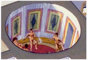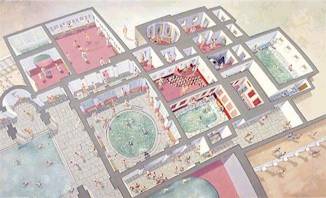 The eastern range of the bath house contained a large tepid bath fed by water that flowed through a pipe from the Great Bath. A series of heated rooms were developed here which became progressively larger until the site reached it maximum extent in the fourth century AD. As part of the presentation of the site today, decorated walls have been suspended over the line of surviving wall foundations from the fourth century AD. This gives visitors an impression of the enormous size of some of the rooms in this bath house.