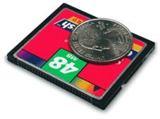 CompactFlash consists of a small circuit board with Flash-memory chips and a dedicated controller chip, all encased in a rugged shell that is several times thicker than a SmartMedia card. As shown below, CompactFlash cards are 43 mm wide and 36 mm long, and come in two thicknesses: Type I cards are 3.3 mm thick, and Type II cards are 5.5 mm thick.