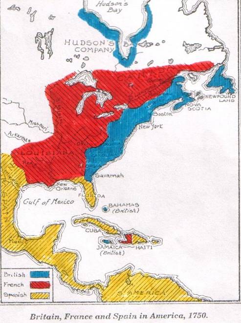 The French had trading posts in canada down to the Great Lakes, and along the Mississipi River. The Spanish were well estabilished in the south, and only later England Colonized the costes of North America.