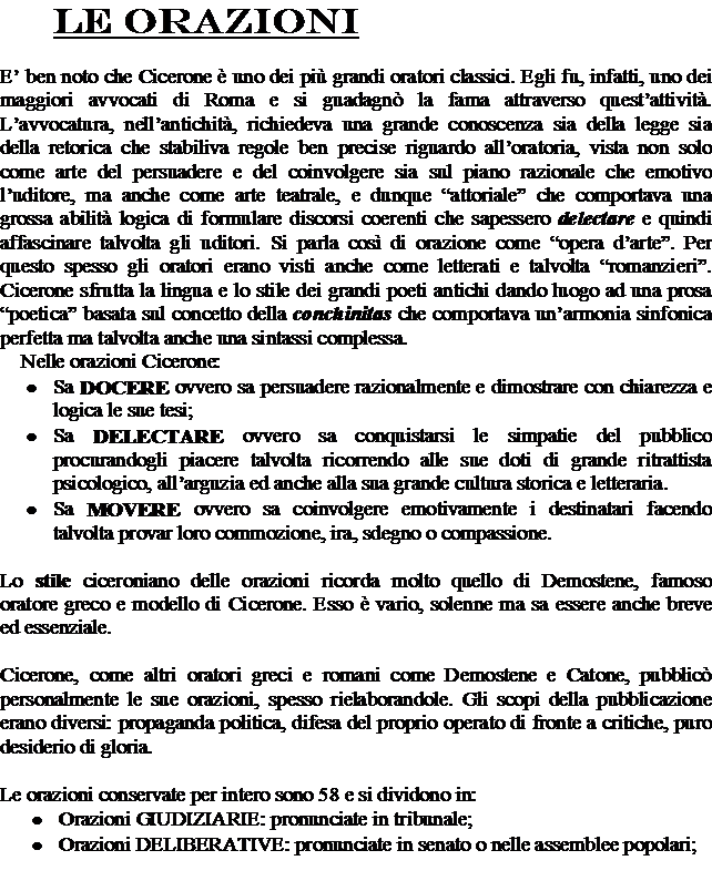 Le opere retoricheCicerone trattò di retorica (=scienza e tecnica della persuasione) in diverse opere tra cui le più importanti sono il De oratore, il Brutus e l'Orator.