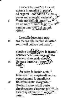La stessa funzione viene assunta dall'onomatopea del v.12, che si allarga a un'immagine più completa nei due versi successivi; infine, nella terza strofa, l'inquietudine diventa palese ma al contempo più misteriosa, con il riferimento simbolico ai "sistri d'argento" che vengono scossi dalle cavallette.