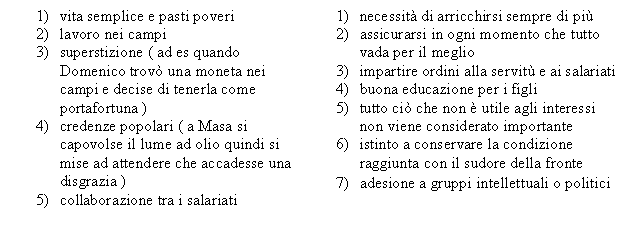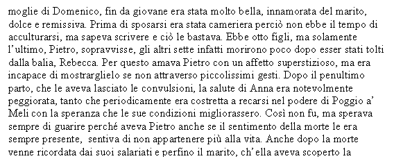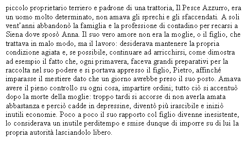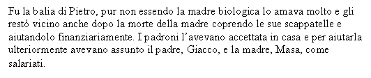 , non buttava via niente, aveva i calzoni di fustagno verde ricoperti di toppe. Rispettava il padrone e voleva bene a Pietro e quando egli cambiò gli dispiacque molto. Ogni volta che parlava la sua grossa testa faceva un grande sforzo per star diritta. Il suo volto era pieno di rughe e la pelle era bruciata dal sole. La bocca non si vedeva sotto i baffi arruffati.