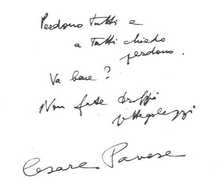 In una delle ultime note scritte sul suo diario "Il mestiere di vivere" il 16 agosto del 1950 si legge: "La mia parte pubblica l'ho fatta, ciò che potevo. Ho lavorato, ho dato poesia agli uomini, ho condiviso le pene del vivere.", il 17 agosto scrive: "Non ho più nulla da desiderare su questa terra. Questo il consuntivo dell'anno non finito, che non finirò.", le ultime parole del diario, il 18 agosto, sono: "Più il dolore è determinato e preciso, più l'istinto della vita si dibatte, e cade l'idea del suicidio. Sembrava facile a pensarci. tutto questo fa schifo. Non parole. Un gesto. Non scriverò più."