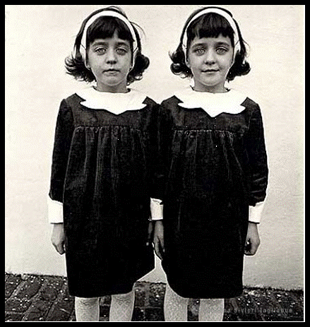 Una foto di due giovani sorelle gemelle, una accanto all'altra, vestite in velluto. Una leggermente sorridente e l'altra leggermente imbronciata, sono la caratteristica bipolare della fotografia stessa. Anche se identiche nell'aspetto, le due bambine presentano stati d'animo differenti, ciò che la fotografa vuole far comprendere è che la somiglianza somatica non è per forza sintomo di una somiglianza interiore. Chi consideriamo uguale a noi può rivelarsi, in un secondo momento, differente da noi, e chi invece consideriamo differente, e quindi lontano, può scoprirsi, molto più vicino di quanto pensassimo.