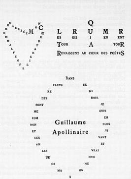 Come detto, con questa lirica di Apollinaire, figura centrale dello sperimentalismo letterario francese di primo Novecento, ci imbattiamo in una concezione della poesia e in un testo concreto assai diversi da quelli precedentemente proposti. In primo luogo colpisce il ricorso a una dislocazione non tradizionale delle parole sulla pagina, che in altri testi si spinge sino a comporre tipograficamente delle vere e proprie figure, i calligrammi che danno titolo alla raccolta (o 'ideogrammi lirici' come nel caso di 'Il pleut', = 'Piove'). Tale espediente, in verità autorizzato dall'ultimo Mallarmé, è soprattutto tipico della lirica futurista italiana e risente delle suggestioni del movimento cubista.