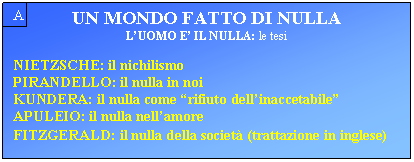 UN MONDO FATTO DI NULLA L'uomo è il nulla: tesi F.W.Nietzsche: Critica e soluzione al nichilismo, visto come svalutazione dei valori. Il nulla è assenza di fondamento, caos, abisso morale e materiale, annullamento dei miti della metafisica, tentazione continua al ricorrere alle illusioni tranquillizzatrici della religione, della metafisica e della scienza che hanno "ucciso Dio". Soluzione : l'Oltreuomo e la volontà di potenza. (Bibliografia:Nietzsche) |