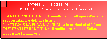 CONTATTI COL NULLA L'uomo e il nulla: come si pone l'uomo in relazione al nulla L'Arte concettuale: L'opera si fa nulla, l'idea diventa l'arte. Analisi a partire dall'installazione "Nothing" di J.Kosuth, con riferimenti ai "Paragraphs on conceptual Art" di Sol Lewitt. (Bibliografia:Arte concettuale) |