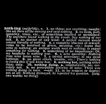 Per chiarire il nesso è fondamentale l'opera di Joseph Kosuth che (guarda che caso!) si intitola "Nothing". L'opera fa parte di un complesso di esposizioni che vanno sotto il titolo di Art as Idea as Idea (Arte come idea come idea), ovvero l'idea de "l'idea dell'arte". Nella sua intricatezza, questo titolo si risolve nelle semplici definizioni, prese dal vocabolario, di alcuni concetti. Sono i concetti artistici che, anzichè evolvere in arte concettuale, vengono a loro volta concettualizzati e diventano, come termini e come idee che esprimono, Arte. In particolare Nothing è la definizione del nulla: l'arte si impadronisce, così, di un concetto che anche per la speculazione filosofica è irragiungibile. La Parola si fa idea dell'Arte ed è in grado di esprimere il concetto che racchiude, eccetto, però, ciò che c'è di emotivo in esso: è un'arte scientifica. L'immadiatezza della parola esprime appieno quello stimolo mentale esente da ogni emotività che vuole offrire l'Arte Concettuale.