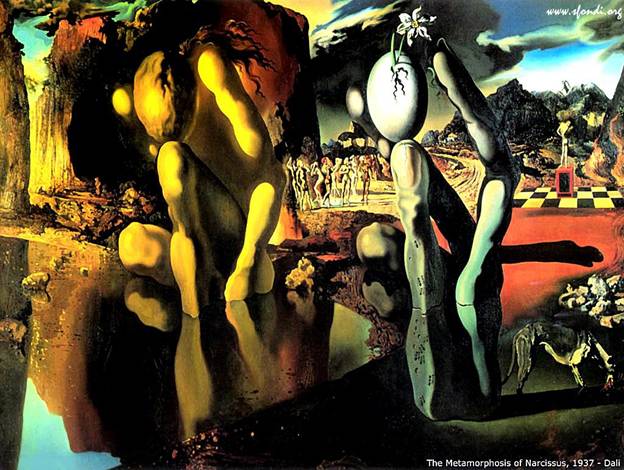 Nel dipinto di Dalì sono raffigurate due immagini: da una parte vi è Narciso seduto in riva al fiume con la testa appoggiata sul ginocchio, dall'altra vi è una mano che regge un uovo da cui sboccia un narciso, l'unico elemento che richiama il mito. Le due parti sembrano completamente divise da sfondi diversi ma, ad uno sguardo più ravvicinato, ci si può accorgere della continuità del paesaggio. Inoltre, mentre a sinistra appare Narciso ancora nel momento dell'ammirazione di sé e del dolore per l'impossibilità di conciliarsi con se stesso, a destra si nota la mano di pietra, rappresentante la morte di Narciso, che regge un uovo (antico simbolo di fertilità e di rinascita) da cui nasce il fiore, ossia il momento successivo alla morte, quando gli Dei hanno deciso di trasformare il giovane per conservarne la memoria.