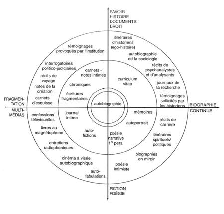 Nonostante nella ruota lecarmiana il ricorso a una serie di linee nette di demarcazione tra le varie sezioni non sia in grado di suggerire visivamente un dato di incontestabile validità nell'odierno panorama letterario, ovvero quell'intreccio di forme e contenuti che dimostra quanto siano in effetti porosi e mutevoli i confini che separano le pratiche autobiografiche10, i raggruppamenti e le relazioni stabilite da Lecarme hanno il merito di mettere in luce la sintomatica interdisciplinarietà e intergenericità dell'autobiografia