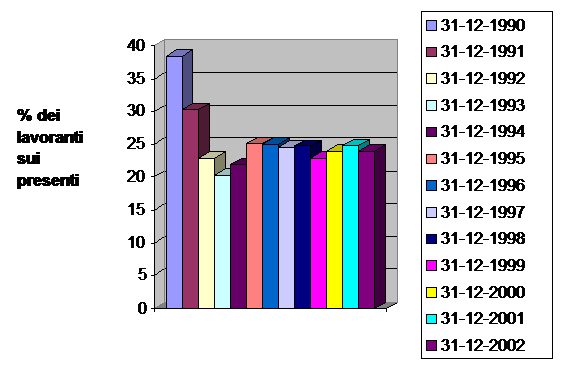 Fra tutti i detenuti nelle carceri italiane (55.677 detenuti a dicembre 2002), solo 1474 hanno la possibilità di svolgere un lavoro. I dati si riferiscono al 31.12.02. Si è passati da una percentuale del 43,54% di detenuti lavoranti nel giugno del 1990 all'attuale che è del 24,2%. Dunque, solo un detenuto su quattro, circa, ha oggi la possibilità di svolgere un lavoro e, in moltissimi casi, si tratta di un lavoro a stipendio dimezzato, perché condiviso con un altro detenuto che, altrimenti, non avrebbe quest'opportunità. L'83% dei detenuti lavoranti è alle dipendenze dell'amministrazione penitenziaria, svolgendo soprattutto lavori quali pulizie delle strutture carcerarie e preparazione e distribuzione del vitto. Il restante 17% sono per la maggior parte (68%) semiliberi, dipendenti da datori di lavoro esterni[9]. C'è da notare che il numero dei posti di lavoro disponibili negli istituti carcerari è stabile, malgrado il numero dei detenuti cresca. Per quanto riguarda il lavoro fuori dal carcere, la "macchina' burocratica è lenta e complessa, tanto da rallentare le possibili assunzioni. Inoltre, il diritto al lavoro ai detenuti sancito per legge, non è poi attuato per legge, ma quasi esclusivamente grazie all'operato e l'interessamento del volontariato.