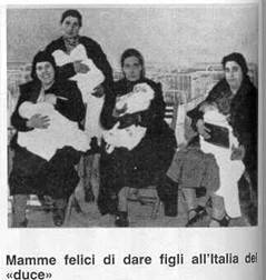 Infatti, secondo l'ideologia fascista la "missione" della donna era una sola: "far figli, molti figli, per dare soldati alla patria", come ricordava sempre Mussolini nei suoi discorsi.