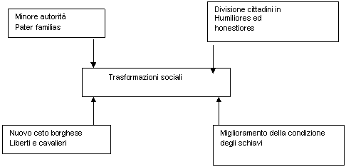 Abbiamo già sottolineato più volte come sin dalle origini la famiglia fosse la prima e più importante istituzione della società romana. Essa però vide minacciata la propria integrità già nella tarda età repubblicana e ancor più nei primi secoli dell'impero. La crisi della morale tradizionale, già denunciata da Catone, era dovuta essenzialmente a due fattori: da una parte, l'introduzione di modelli di vita importati dall'Oriente, dall'altra il clima politico‑sociale segnato dall'incertezza e dalla confusione portato dalle guerre civili. Durante questi periodi l'autorità del pater familias si indebolì e si verificarono situazioni di grande tensione, come era già successo al tempo delle proscrizioni di Silla, quando non furono rari i casi di familiari che si denunciavano reciprocamente Anche la società nel suo insieme, nell'età imperiale, mutò sensibilmente. Essa tese infatti a stratificarsi non più secondo gli ordini tradizionali (patrizi e plebei, con liberti e schiavi agli ultimi ranghi), bensì secondo la nuova divisione tra humiliores e honestiores.