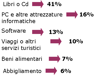 (dati statistici dei beni e servizi acquistati in Italia tramite internet , relativi al periodo 2002-2003; attualmente lfe-commerce è in continua ascesa: secondo le previsioni OCSE entro il2006 rappresenterà il 5% del totale degli scambi mondiali, per un totale di 1600 miliardi di dollari. )