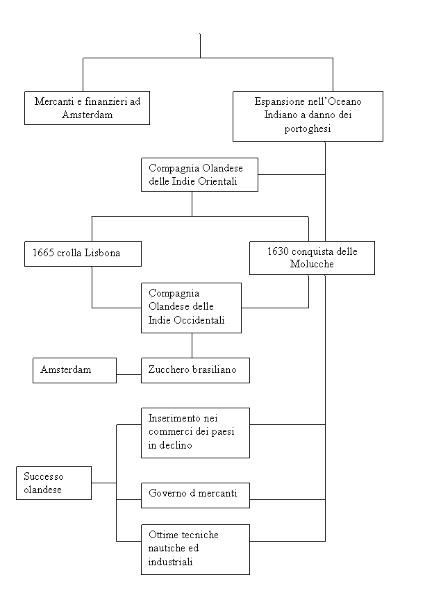 I paesi che riuscirono ad affrontare meglio la crisi furono l'Olanda e l'Inghilterra. L'Olanda era una delle sette Province unite dei Paesi Bassi che in precedenza avevano dichiarato la loro indipendenza dalla Spagna; nel momento in cui l'Inquisizione aveva esiliato numerosi gruppi di calvinisti, questi si recarono direttamente ad Amsterdam, dove portarono le loro competenze commerciali e finanziarie. Intorno al 1600 gli olandesi avevano allargato i loro commerci prima nell'area baltica a danno delle città dell'Hansa tedesca, poi nell'Oceano Indiano a danno dei mercanti portoghesi, decisi alleati spagnoli. Inizialmente le spedizioni commerciali non ebbero esiti eclatanti, ma diedero un ottimo input per successive partenze. Ben presto di formarono diverse compagnie olandesi che commerciavano nell'area indiana, ma per eliminare la competizione interna e in fondo anche quella esterna, si diede vita ad una sola Compagnia Olandese delle Indie Orientali, l'unica ad avere il monopolio assoluto su quella specifica area geografica. I contrasti commerciali tra Olanda e Portogallo diventarono una vera e propria guerra che sfociò in un conflitto nel 1665, vinta dagli olandesi, che vide il quasi totale annientamento dell'impero commerciale di Lisbona. Questo tipo di offensiva fu esteso dagli olandesi verso tutti i nemici europei e nel 1630 ottennero il controllo sulle Molucche. Il Portogallo mantenne il dominio solo su Goa, lasciando il Capo di Buona Speranza agli olandesi. Nel 1621 venne creata una seconda compagnia olandese, stavolta delle Indie Occidentali, che però inizialmente si occupava di pirateria; essa fondò la città di Nuova Amsterdam in America (New York) e si interessò sempre in forma maggiore alle piantagioni di zucchero in Brasile.