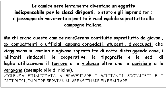 Questo avviene grazie alla COSTITUZIONE DELLE SQUADRE D'AZIONE FASCISTE DETTE ANCHE CAMICE NERE (per distinguersi dai movimenti socialisti che portavano il colore rosso e quelli cattolici che portavano il colore bianco).