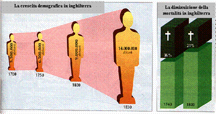 Causa e anche effetto della rivoluzione industriale fu anche il fortissimo aumento demografico che avvenne in tutta Europa, ma sopratutto in Inghilterra, e la riduzione della mortalita’ grazie ai miglioramenti in campo igenico e sanitario. Nei grafici si possono apprezzare i risultati di questi effetti.